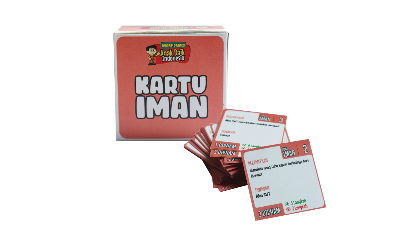 Kartu ini dibuat dengan bahan art carton 210 gram, disempurnakan dengan Box Kartu khusus untuk memastikan Kartu ini tidak mudah hilang. Terdiri dari Edukasi Pengetahuan, Aksi Kebaikan, Tantangan Seru, Tantangan Kreatif, Tantangan Kritis hingga Literasi Al Qur`an tentang Iman, menemukan motivasi dan “why” kita harus memiliki iman yang kuat dan akidah yang selamat.